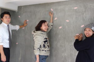 タイル納品の最終日、オーナー、施工会社、メーカー、今回のメンバー全員が横浜に集まった。打ち合わせの中で、せっかくなのでみんなで施工までしましょう、という話になったのだ。タイルは、壁面に散りばめられたように、ランダムに施工することに。全員で貼っていくうちに、「初めての経験で貼るのは楽しい」「タイルってよく見るととてもキレイ」と、タイルを手にして自然と笑顔が溢れた。