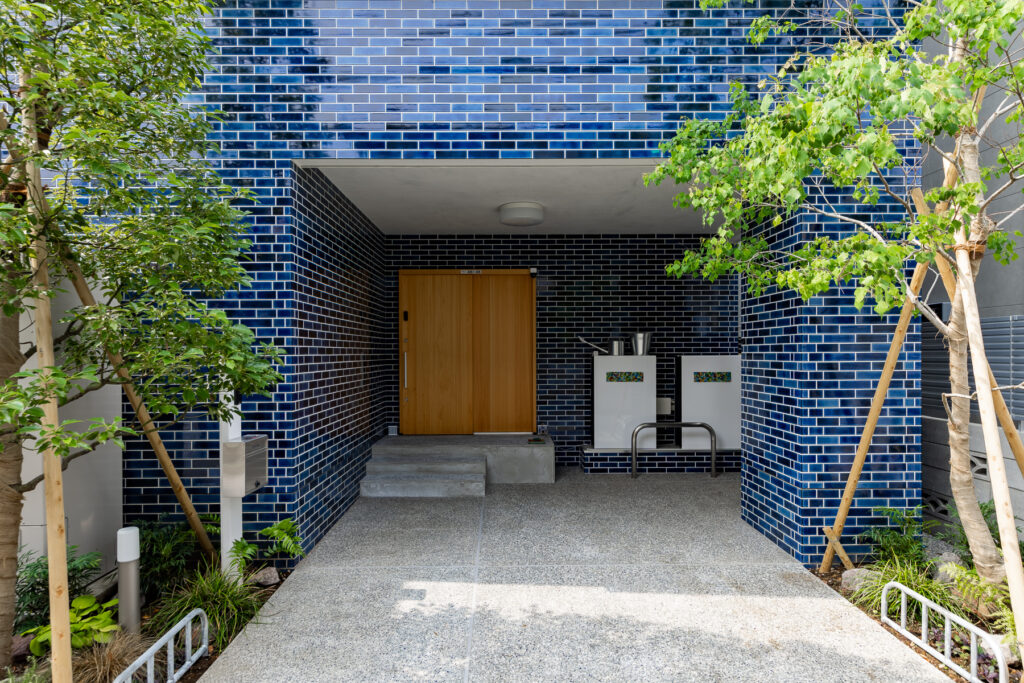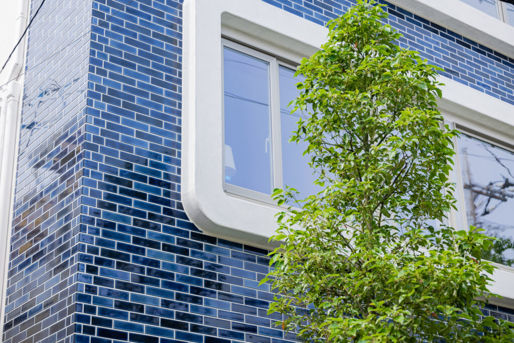 建物の角がまるで“一枚のブルータイルで繋がっている”ように見える仕上がりは、本プロジェクトならではの大きな成果です。