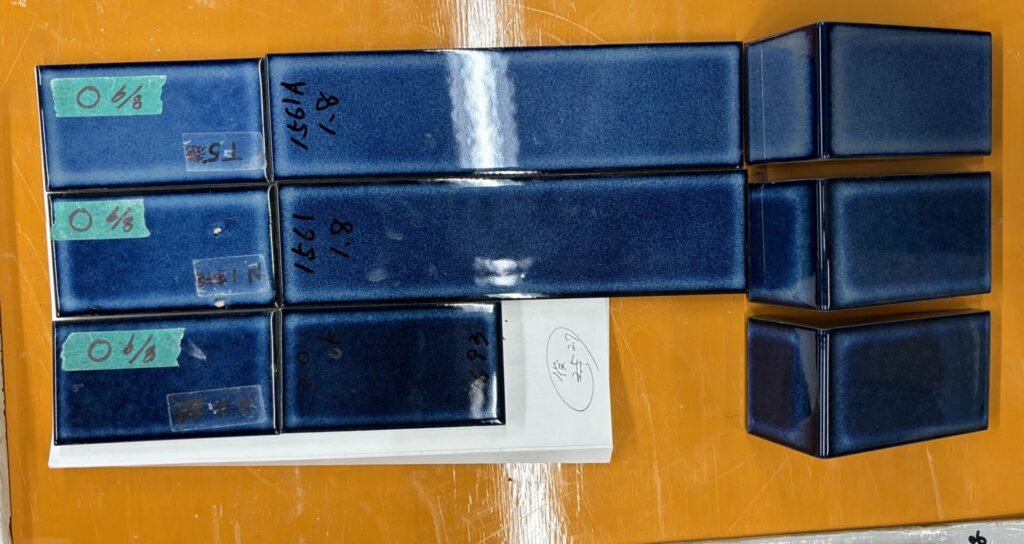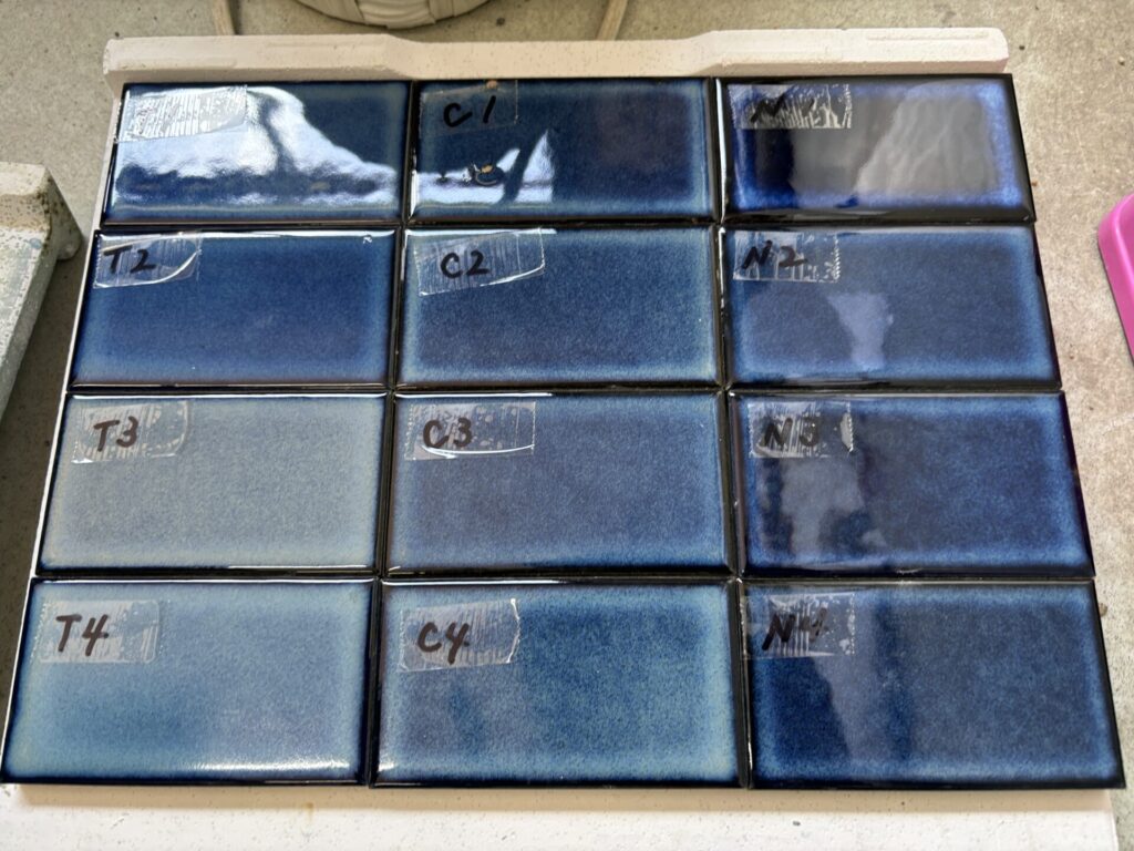 複数の釉薬と焼成条件を比較しながら深さ・透明感・反射具合を調整し、単色で仕上げるのではなく、複数の濃淡を同時に焼き込むことで“貼りあがったときに全体で揺らぎが生まれるブルー”を目指しました。
