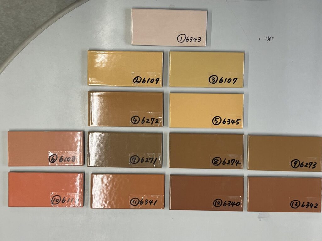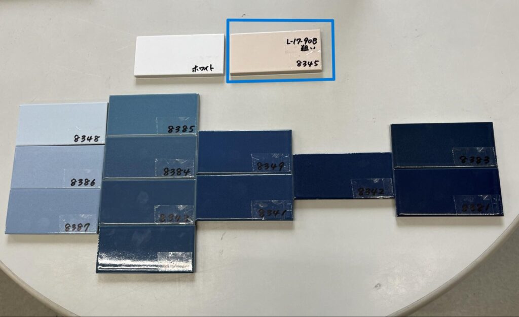 インクの色見本と違い、釉薬はわずかな配合差でも印象が大きく変わります。開発したタイルはその都度お客様へお送りし、実際のタイルをご確認いただいたうえでフィードバックをいただき、再調整へと進みます。
