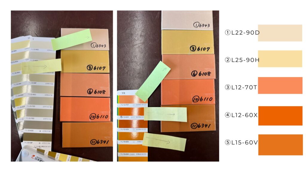 「少し黄みを抑えたい」「もう一段深くしたい」といただいたご意見を踏まえながら、サンプルを並べて比較し、検証を重ね、理想のグラデーションに近づけていきました。