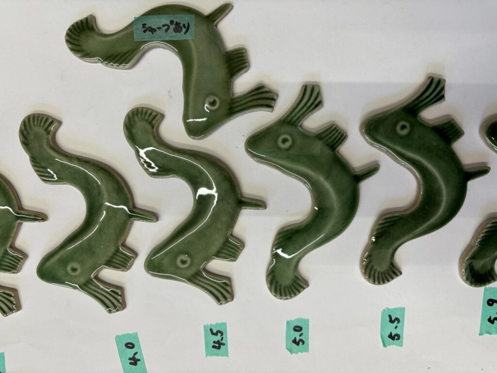さらに、釉薬量のテストや濃淡試験を行い、魚たちが連続して並んだときに“泳ぎ出すように見える”表情を意図的に生み出しました。