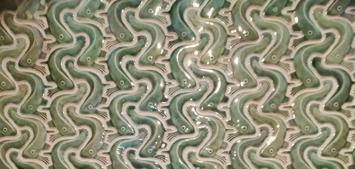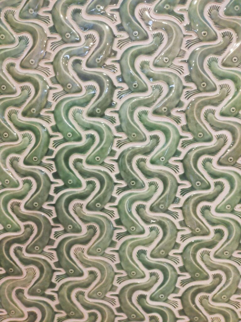 今回制作した魚タイルは、幾何学模様の“マスタイル(Muster Tile)”シリーズの一作。題材となったのは、1899年のウィーン工房《Ver Sacrum》に掲載された魚の意匠です。120年以上前に描かれたデザインを、美濃焼の技術によって立体的に再構築し、歴史的図様を現代の空間へと復活させる試みとなりました。
