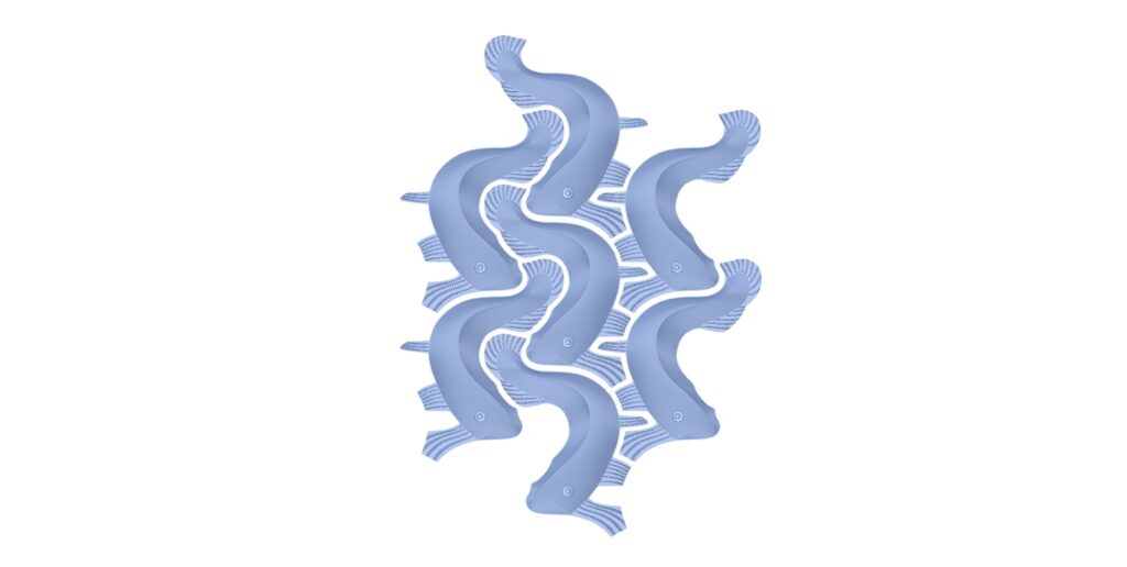 出来上がった壁面は、一見すると魚とは分からないほど抽象的でありながら、近づくほどに細部の造形が浮かび上がり、魚たちの姿が自然と見えてくる仕掛けになっています。
