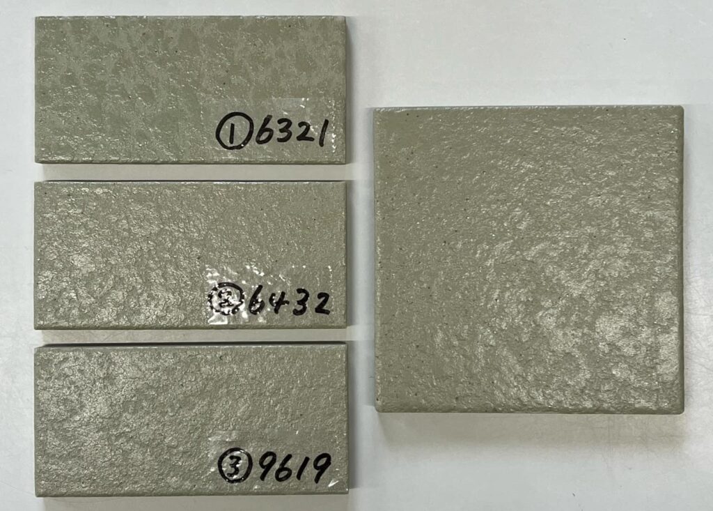 色調検討にあたっては、写真や数値だけで判断せず、一部、実物の既存タイルを工事会社様からお送りいただき、色開発をスタートしました。