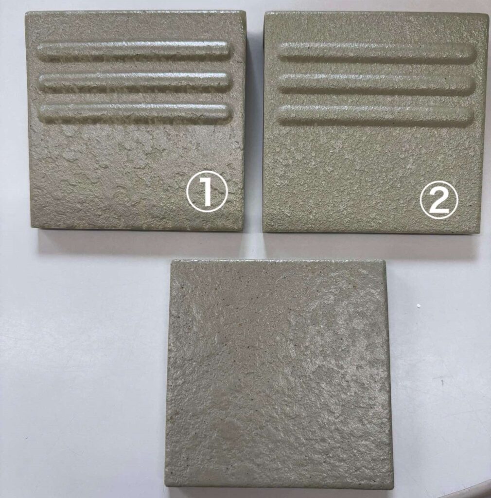 また、開発したタイルサンプルを現地へお送りし、実際に目で見て問題がないかを確認していただいています。現場では、日向と日陰、既存タイルとの並び、階段の立体感によって印象が大きく変わります。