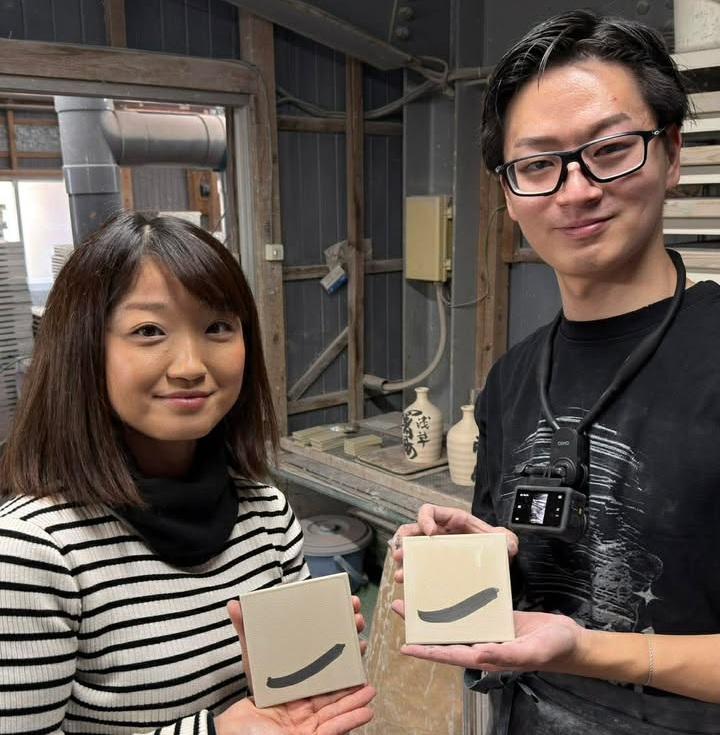 窯で焼き上がると、白い釉薬の上に黒い筆跡がくっきりと浮かび上がります。