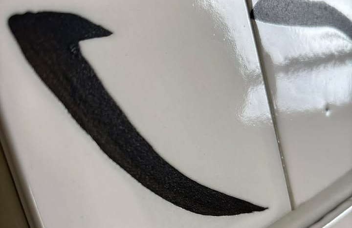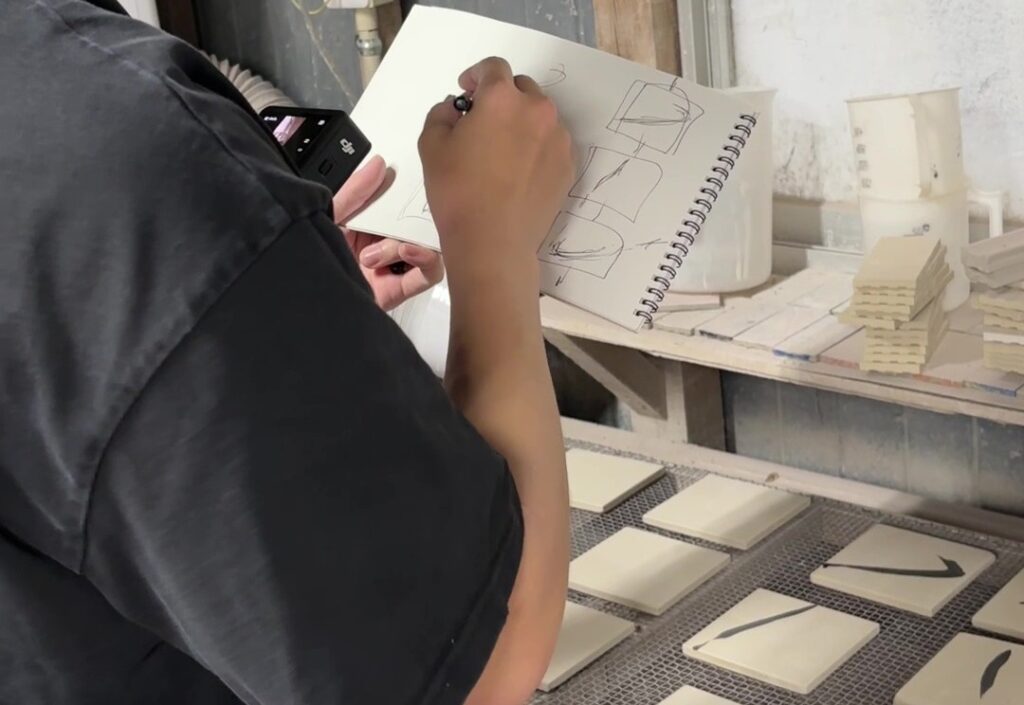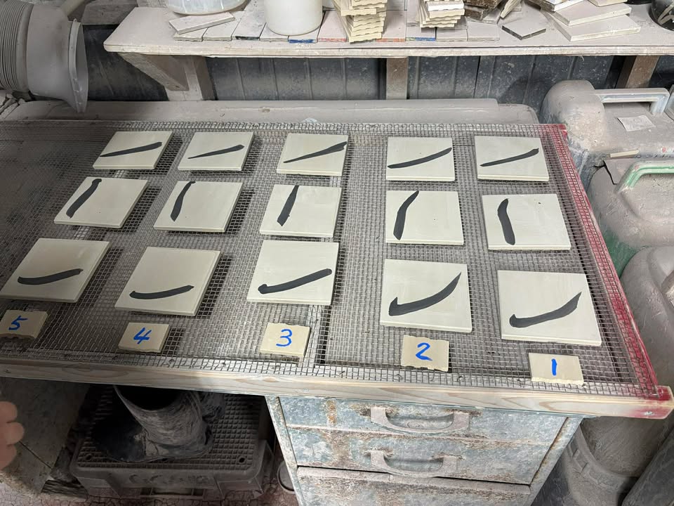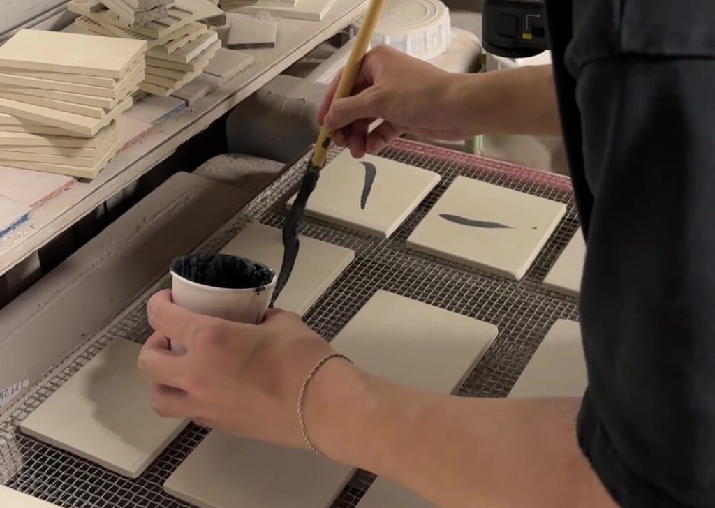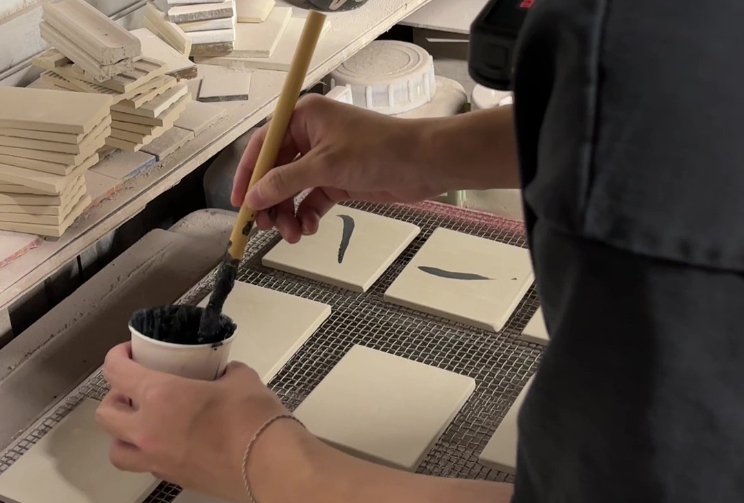 今回は、書の一画をタイルに焼き付け、紙に宿る力強さやにじみをタイルでどこまで表現できるかを探ります。